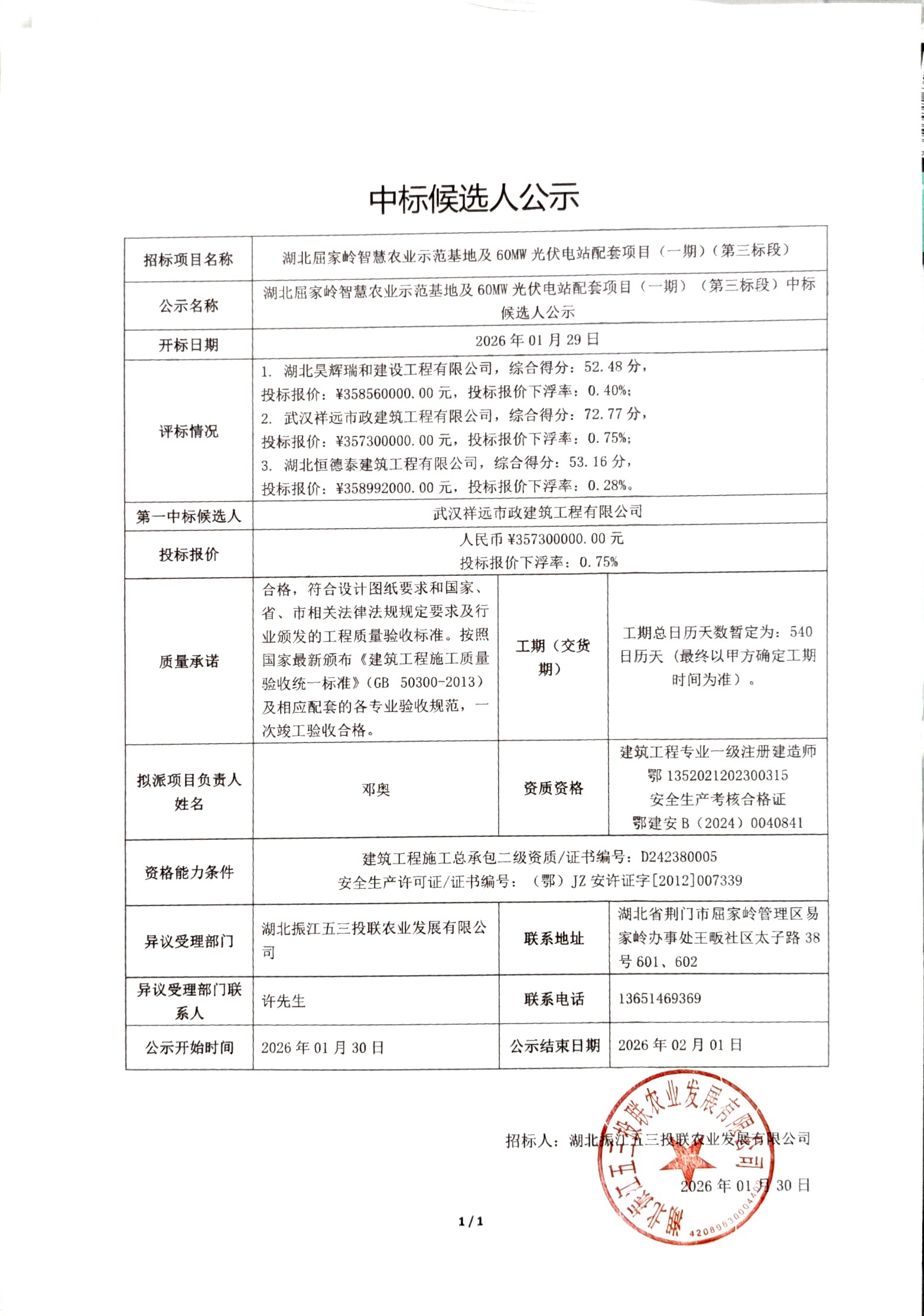 湖北屈家岭智慧农业示范基地及60MW光伏电站配套项目(一期)(第三标段)中标候选人公示