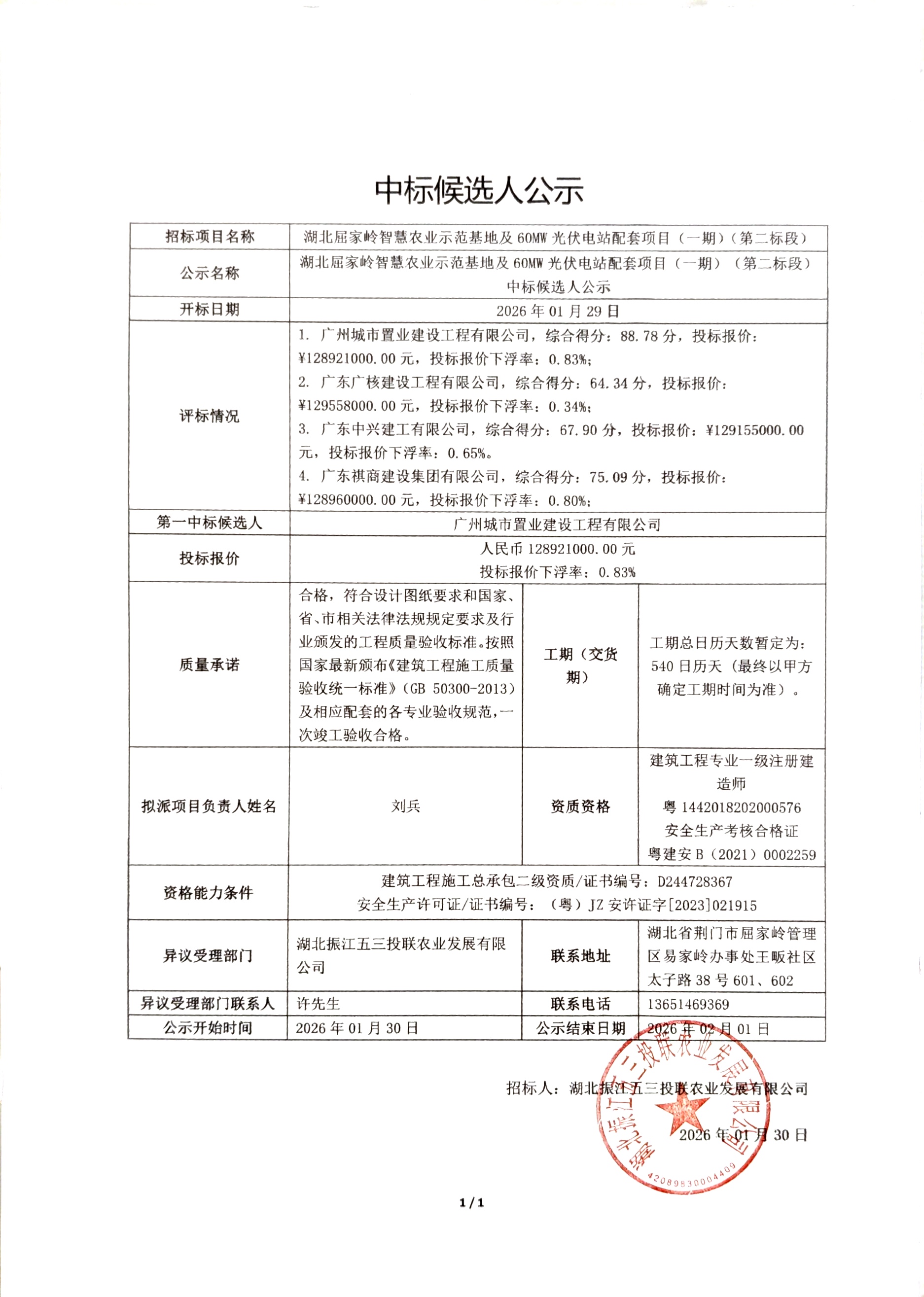 湖北屈家岭智慧农业示范基地及60MW光伏电站配套项目(一期)(第二标段)中标候选人公示